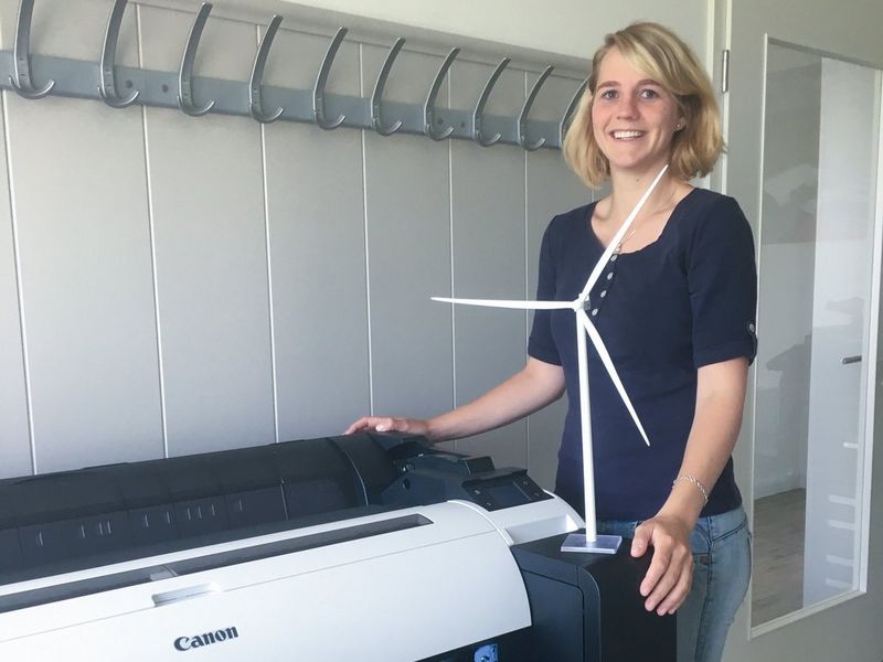 Christina Müller ist seit zehn Jahren als Ingenieurin in der Windparkprojektierung mit den Schwerpunkten Projektentwicklung, Genehmigungsverfahren und Bauausführung tätig. Als Planerin der Windstärke Nord GmbH obliegt ihr die gesamte Erstellung aller Pläne, die für die Genehmigung und die Fertigstellung eines Windparks benötigt werden: „Vorab analysiere ich auf Basis von Geodaten alle Faktoren, die einen möglichen Standort limitieren, wie etwa die Bebauung, das Vorhandensein von Gewässern, Naturschutzgebiete und vieles andere mehr“, erläutert Christina Müller. Daraus entsteht dann am CAD-Programm die so genannte Freiflächenkarte, die mögliche bebaubare Gebiete nach den gesetzlichen Vorgaben. ausweist. Die Zielgruppe von Windstärke Nord sind Bürger und Genossenschaften, die kleine regionale Windparks projektieren wollen. „Ein solches Projekt erstreckt sich in der Genehmigungsphase über viele Monate, und zum Genehmigungsantrag bei den zuständigen Behörden gehören auch detaillierte Pläne, die wir selber drucken“, so Christina Müller. Jede Grenze, jeder Radius muss im Maßstab 1:2000 gestochen scharf abgebildet werden, geht es doch in der Natur um möglichst exakte Abstände. Auf Basis dieses Materials geben dann die öffentlichen Stellen wie die Bauaufsichten, Behörden oder die Unteren Naturschutzbehörden ihre Stellungnahmen ab. Oft werden überarbeitete Pläne fällig, bis alle Anforderungen erfüllt sind.