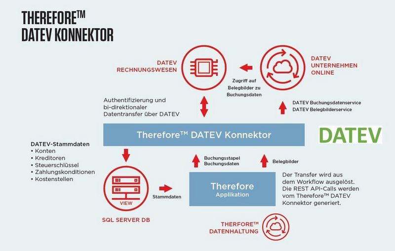 Innerhalb des automatischen, frei gestaltbaren Therefore™ Genehmigungs-Workflows gewährleisten rechtssichere und zeitsparende Prozesse korrekte Daten. Diese werden dann durch die von der DATEV abgenommene Schnittstelle an das Rechnungswesen-Programm der DATEV übermittelt.