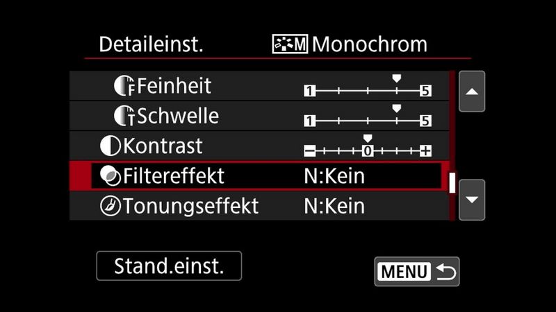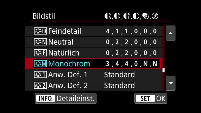 Wie bei den anderen Bildstil-Optionen kann man Monochrome anpassen, um eine Reihe unterschiedlicher Looks zu erzielen. Markiere ihn dazu im Menü Bildstile und drücke die INFO-Taste.