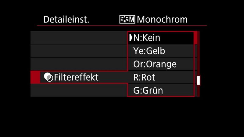 Dadurch entsteht ein starker Kontrast, der sich oft gut für Sommerfotos eignet, weil er den blauen Himmel dunkler macht und Wolken hervorhebt. Eine Erhöhung des Kontrastparameters im monochromen Bildstil kann den Effekt verstärken.