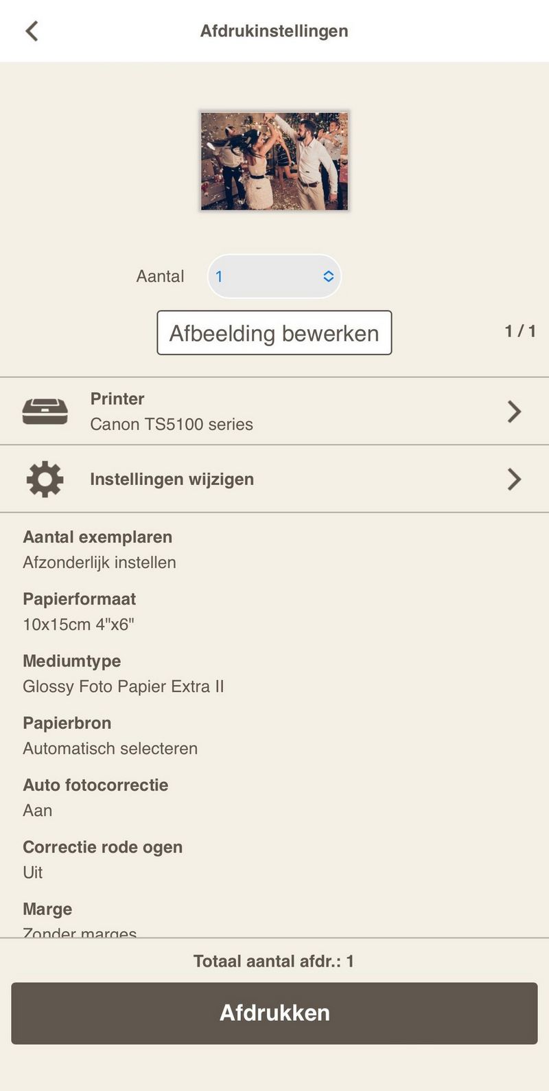 Gefällt Ihnen das Foto? Drucken Sie es dann aus, indem Sie auf „Weiter” drücken. Auf dem Bildschirm, der erscheint, können Sie die Druckereinstellungen überprüfen und anpassen. Drücken Sie auf „Drucken”, dann wird Ihr Smartphone mit dem Drucker verbunden.