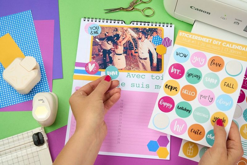 Wählen Sie die Seite im Kalender, auf die Sie das Foto kleben möchten. Mit einer Schere oder einem Fotoschneider können Sie das Format Ihres Fotos noch ändern. Dann kleben Sie das Foto mit (Foto-)Kleber auf und fügen eventuell einen Sticker hinzu. Im nächsten Schritt lesen Sie, wie Sie Ihrem Foto eine besondere Note verleihen.
