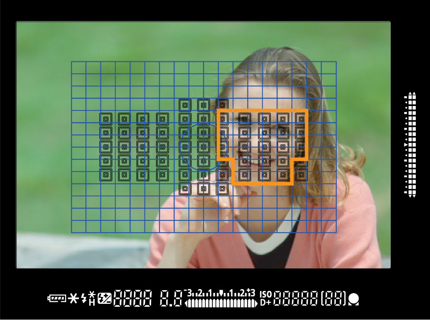 61-Punkt-Weitbereich-AutofokusMit dem 61-Punkt-AF System gelingt selbst bei wenig Licht eine schnelle und präzise Fokussierung. Für zusätzliche Präzision sorgen die 41 Kreuzsensoren, von denen wiederum 5 Felder Doppel-Kreuzsensoren sind. Erweiterte Motiverkennung und -nachführung Das EOS iTR AF-System (Intelligent Tracking and Recognition) nutzt Farb- und Gesichtsinformationen, um sich bewegende Motive innerhalb des Bildausschnitts zu erkennen und die Schärfe auf sie nachzuführen. Die Reaktionsgeschwindigkeit des AF kann mit einem einfach bedienbaren Tool so verändert werden, dass die Schärfenachführung auf Aufnahmesituation und Motiv angepasst wird – Objekte, die das Hauptmotiv kurzzeitig kreuzen, haben so keinen störenden Einfluss auf die Fokussierung.AF-MessfeldwahlAlle 61 AF-Felder können zusammen genutzt werden oder in verschiebbare Gruppen zusammengefasst, um Motive auch außerhalb der Bildmitte abzudecken. Alternativ kann ein einzelnes AF-Feld zur präzisen Scharfstellung auf einen bestimmten Bildbereich genutzt werden.