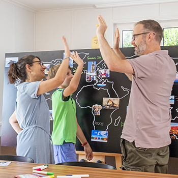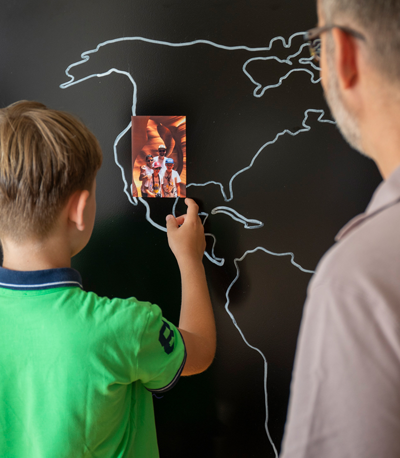 Als abenteuerlustige Familie lieben die Angelones das Reisen und würden am liebsten die ganze Welt gemeinsam entdecken. Da sie mit zwei schulpflichtigen Jungs nur in den Ferien reisen können, planen sie ihre persönliche Weltreise in Etappen, die sie auf einer magnetischen Weltkarte visualisieren und nach der Rückkehr jeweils mit einem Familienfoto dokumentieren. Dank des magnetischen Fotopapiers lässt sich das nächste Wunschziel oder die Reiseroute ganz einfach verschieben.