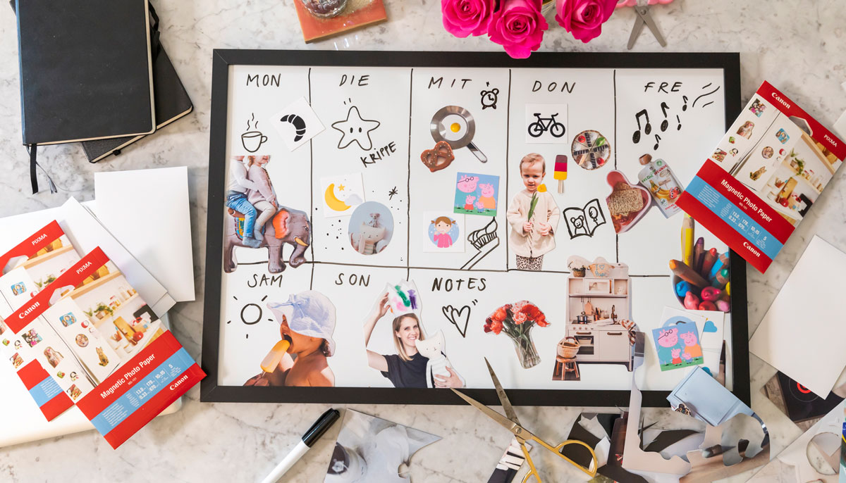 Als Working Mum ist Organisation für Scarlett der alles entscheidende Faktor. Damit auch ihre kleine Tochter sich im Alltag zwischen Krippe, Mamatagen und Freizeitaktivitäten zurechtfindet, hat sie ihr einen magnetischen Wochenplaner mit Familienfotos und bekannten Symbolen gebastelt. Mit dem magnetischen Fotopapier lassen sich diese ganz einfach und jede Woche von Neuem platzieren.