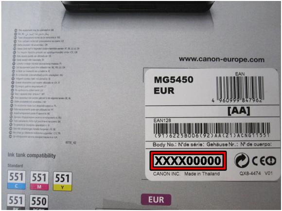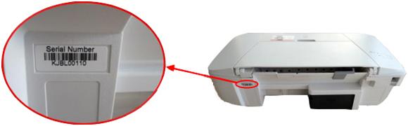 Die Seriennummer Ihres MAXIFY Druckers ist 9 Zeichen lang und besteht aus 4 Buchstaben, gefolgt von 5 Zahlen, z. B. XXXX00000. Die Seriennummer finden Sie auf einem Aufkleber auf der Rückseite des Druckers, wie auf der Abbildung unten markiert: