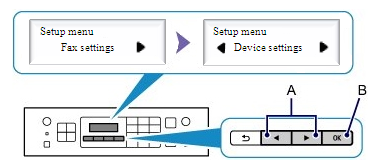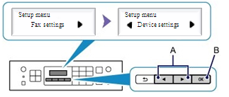 1. Verwenden Sie die Pfeiltasten (A), um [Device settings] (Geräteeinstellungen) auszuwählen, und drücken Sie die Taste [OK] (B).