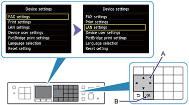 ] (A), um [LAN setting] (LAN-Einstellungen) zu wählen, und drücken Sie [OK] (B).