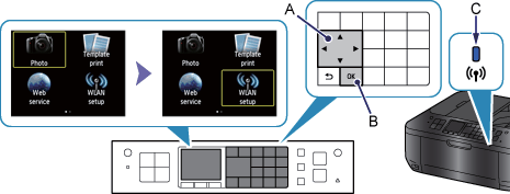 ] (A), um [WLAN Setup] (WLAN-Einrichtung) auszuwählen, und drücken Sie die Taste [OK] (B).