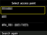 Wenn Sie Ihr Netzwerk in der Liste nicht finden, wählen Sie mit den Pfeiltasten [Search again] (Erneut suchen), und drücken Sie die Taste [OK].