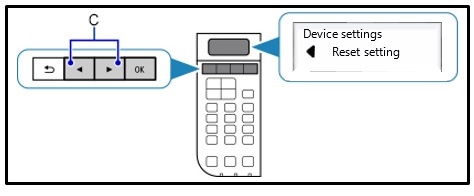 - Verwenden Sie die Pfeiltasten, um [Reset setting] (Einstellung zurücksetzen) auszuwählen, und drücken Sie die Taste [OK].
